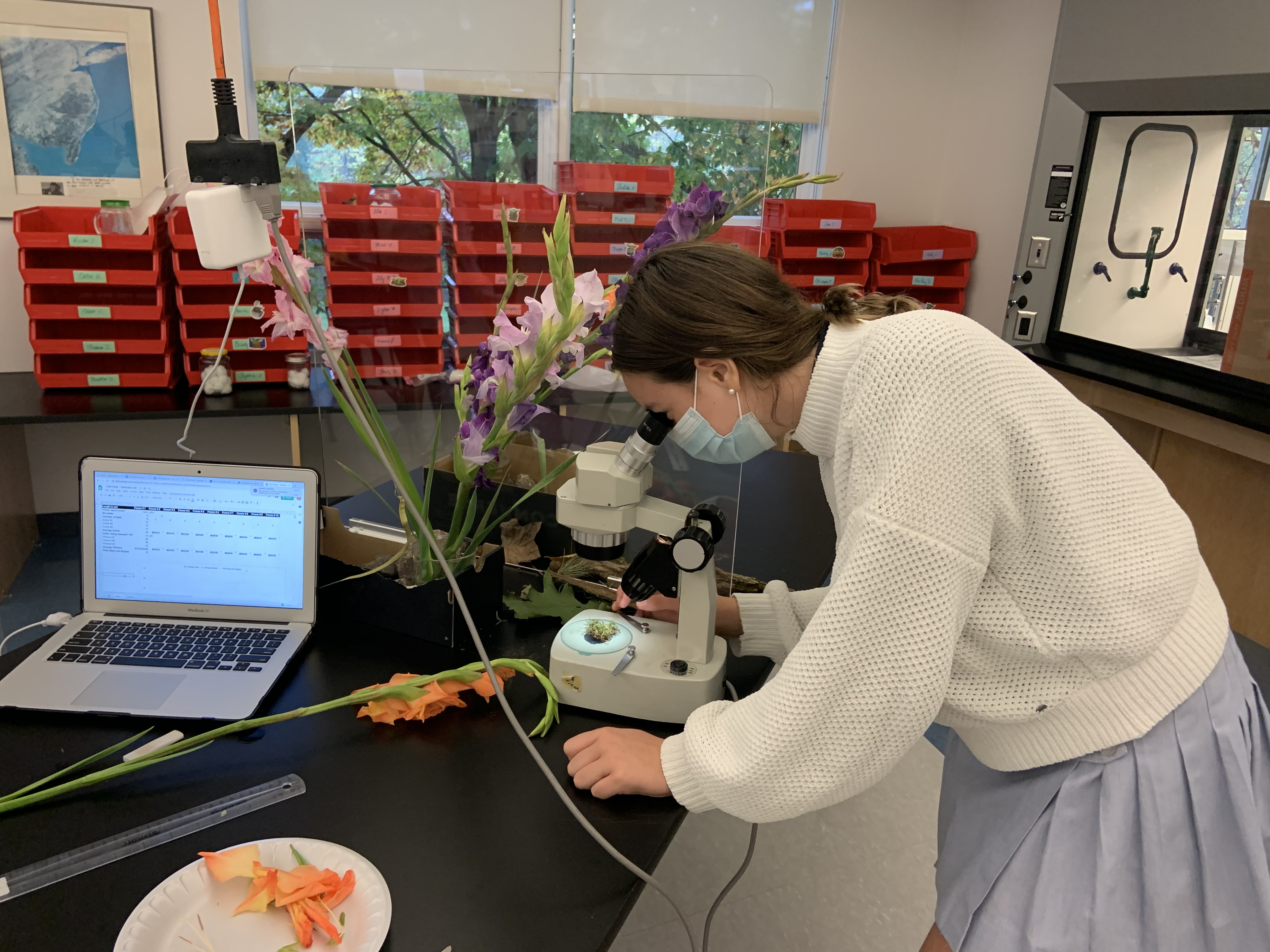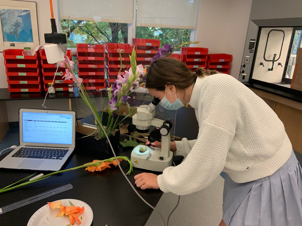 - Materials – dissecting microscope, paper plates, scalpels, ruler, buckets of water for flower storage, strips of paper to label stalks if doing over two days (I stapled a looped piece of construction paper to the stalk with their names on it, different colors for different classes).